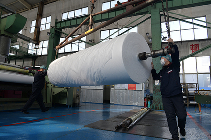 走進(jìn)位于山東省東營市的山東俊富無紡布有限公司(以下簡稱山東俊富)廠區(qū),記者看到一派繁忙景象。據(jù)悉,從1月27日接到工信部通知后他們就一直加班,全部10條生產(chǎn)線24小時(shí)滿負(fù)荷生產(chǎn)。山東俊富生產(chǎn)的熔噴布日產(chǎn)量約13噸,占全國1/10,根據(jù)國家和有關(guān)部門調(diào)度,主要供給湖北和山東的下游企業(yè)。