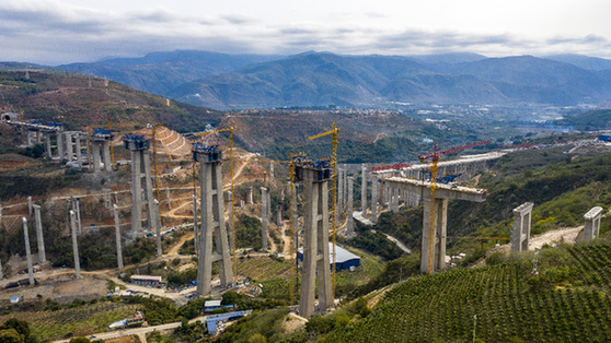 近期,中老鐵路玉溪至磨憨段有序復工復產(chǎn),由中鐵四局承建的中老鐵路全線重點控制性工程——元江特大橋、南溪河特大橋正在加緊施工建設。這是南溪河特大橋橫跨在建高速公路。記者 江文耀 攝