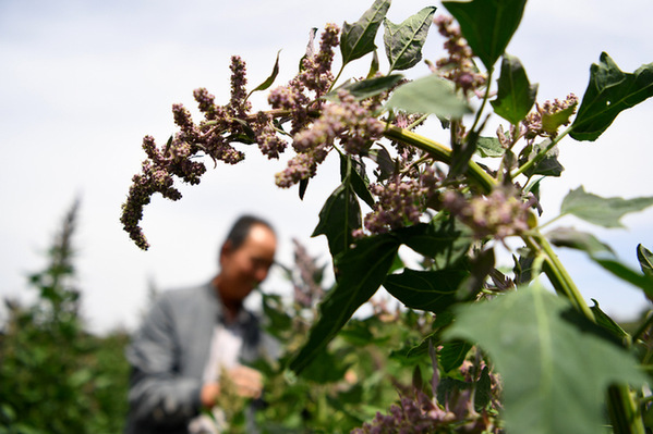 8月2日,天祝藏族自治縣松山鎮(zhèn)大溝興農(nóng)種養(yǎng)殖專業(yè)合作社負(fù)責(zé)人文玉廷在地里查看藜麥生長情況。記者 陳斌 攝