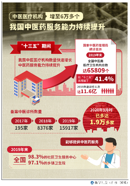中醫(yī)醫(yī)療機(jī)構(gòu)增至6萬(wàn)多個(gè) 我國(guó)中醫(yī)藥服務(wù)能力持續(xù)提升。新華社發(fā) 程碩 制圖