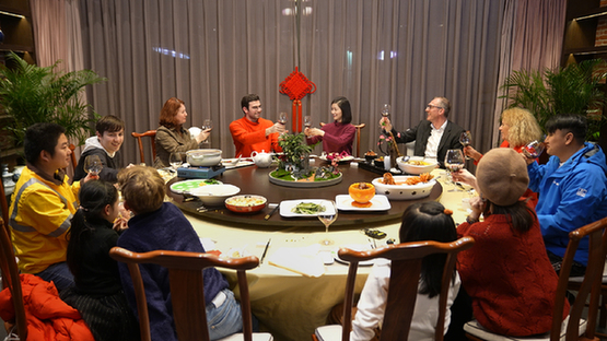 在武漢生活多年的外國(guó)人克萊因、海龍、高佑思,春節(jié)期間在武漢與雷神山、火神山醫(yī)院建設(shè)者,外賣(mài)小哥等共同慶祝新年。記者 熊琦 攝