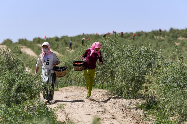 ????“中國(guó)枸杞看寧夏,寧夏枸杞看中寧”。在寧夏中衛(wèi)市中寧縣,一片片枸杞地里,包著頭巾的女工正彎腰采摘枸杞。一行行綠油油的枸杞樹(shù)下,掛滿(mǎn)鮮紅欲滴的枸杞果實(shí)。