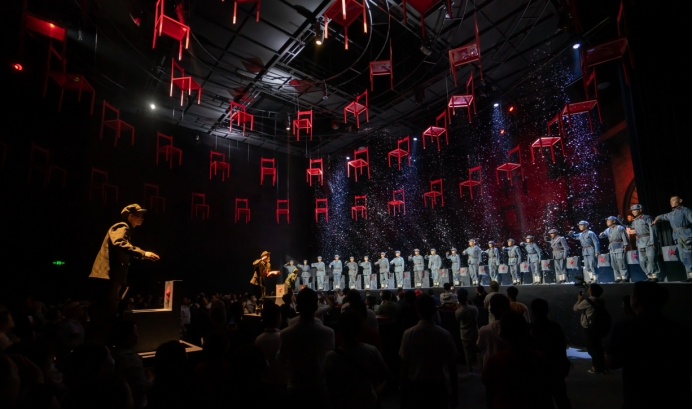 設(shè)計之初,這部劇就盡量打破常規(guī)。觀演方式上,觀眾擺脫常規(guī)的舞臺鏡框模式,跟隨情節(jié)依次進入每個表演區(qū),“邊走、邊看、邊感受”,完全是沉浸式的體驗。其次,這是國內(nèi)首部紅色故事為背景的情景劇,以一本老紅軍日記為線索,展現(xiàn)一個曲折的故事,表達對革命英雄的謳歌與緬懷。在舞臺創(chuàng)新上,該劇首創(chuàng)巨型開合升降裝置,讓觀眾凝視觸摸碩大的紅旗,極大調(diào)動了觀眾情緒,增加互動體驗,這種表達方式在全國舞臺藝術(shù)上也有開創(chuàng)意義。