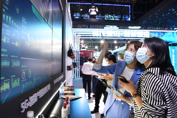 ????在2021智博會(huì)現(xiàn)場(chǎng),工作人員(前左)向觀眾介紹“5G+智能制造”的應(yīng)用。(資料照片)新華社記者 唐奕 攝