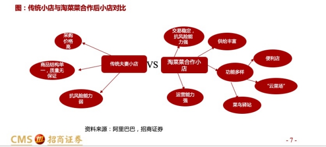 ????招商證券指出,在前端,淘菜菜推動夫妻小店現(xiàn)代化,使其成為功能多元的社區(qū)綜合服務店。淘菜菜提供三方面升級:“云菜場”,支持小店的生鮮生意;?“一店多能”,支持云菜場、便利店、收發(fā)快遞、外賣配送等多種模塊;“品牌店”,扶持一批夫妻小店品牌升級。據(jù)阿里披露,最近半年接入淘菜菜的小店綜合收入提升了30%。