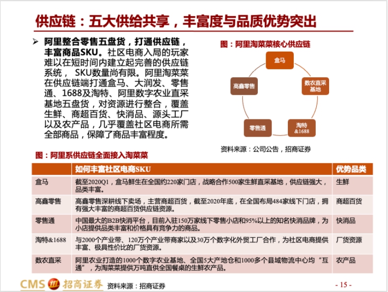 ????招商證券認為,淘菜菜對商品質(zhì)量要求更為嚴格,商品品質(zhì)優(yōu)于競對。農(nóng)產(chǎn)品和生鮮具有非標、易損等特點,供應鏈相對復雜。淘菜菜從供應鏈源頭把控產(chǎn)品品質(zhì),為1671款生鮮制定了16道品質(zhì)管控流程。在履約端,目前淘菜菜三溫層倉運冷鏈覆蓋率達到100%,中午12點送達率超過99%,均為行業(yè)領先。此外,淘菜菜還獲得菜鳥支持。后者網(wǎng)絡體系龐大,覆蓋全國2700多個區(qū)縣,能夠與淘菜菜形成良好的協(xié)同效應。