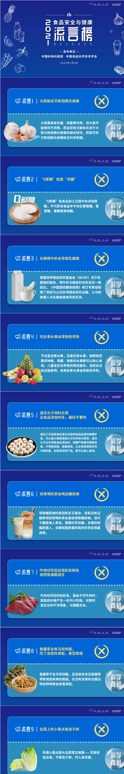 據(jù)悉,本次會議上,中國科協(xié)科普部和中國食品科學技術(shù)學會還聯(lián)合發(fā)布了《2021年食品安全與健康流言榜》。