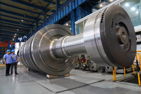 2021年7月1日,中國一重集團(tuán)有限公司軋電制造廠生產(chǎn)車間,工人在對企業(yè)自主制造的百萬千瓦整鍛低壓轉(zhuǎn)子進(jìn)行檢測作業(yè)。新華社記者 王建威 攝