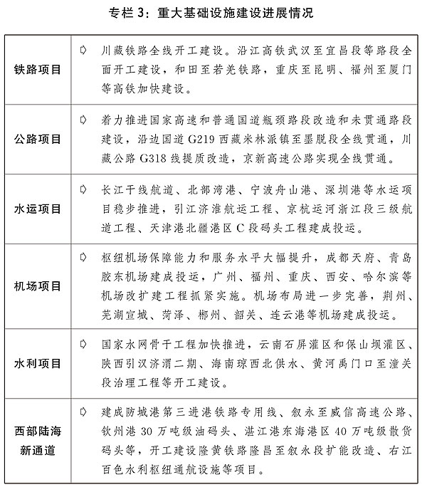 四是適度超前開展重大基礎設施建設。精準有效推進交通、水利、物流、能源、新型基礎設施、民生等領(lǐng)域重大基礎設施項目建設。推進川藏鐵路、西部陸海新通道、沿江高鐵、一批鐵路專用線重點項目和川藏公路G318線提質(zhì)改造等加快建設。整體推進京津冀、長三角、粵港澳大灣區(qū)城市群城際鐵路、市域(郊)鐵路建設。鼓勵推廣軌道交通+土地綜合開發(fā)模式經(jīng)驗。做好中長期鐵路網(wǎng)、國家公路網(wǎng)和全國港口與航道布局規(guī)劃修編,強化國家公路、港口和高等級航道網(wǎng)絡功能。推動三峽水運新通道研究論證。實施國家水網(wǎng)重大工程。加快發(fā)展公鐵水多式聯(lián)運。提升樞紐機場綜合保障能力和服務水平,加快培育支線航空市場,提高國際航空貨運能力。加快“支點城市+骨干走廊”現(xiàn)代流通網(wǎng)絡建設。穩(wěn)步推進國家物流樞紐、國家骨干冷鏈物流基地建設,強化冷鏈運輸環(huán)節(jié)疫情防控措施,完善“321”冷鏈物流運行體系。加快物流業(yè)制造業(yè)融合創(chuàng)新發(fā)展,積極推動多式聯(lián)運、智慧物流等新業(yè)態(tài)新模式發(fā)展。布局一批新型基礎設施項目,加快推進5G、千兆光網(wǎng)、一體化大數(shù)據(jù)中心、北斗產(chǎn)業(yè)化重大工程、民用空間基礎設施等建設,推動傳統(tǒng)基礎設施智能化改造。