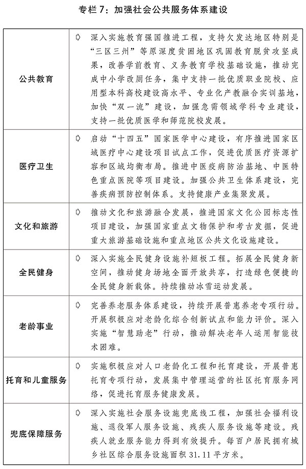 四是完善公共服務政策制度體系。分類推進基本公共服務均等化發(fā)展,推動服務重心向基層下沉,增加普惠性非基本公共服務供給。支持社會力量增加普惠性托育服務供給,進一步完善學前教育收費政策,推進普惠性學前教育資源擴容增效,推進兒童友好城市建設。推動義務教育優(yōu)質(zhì)均衡發(fā)展和城鄉(xiāng)一體化,提升農(nóng)村學校辦學能力,依據(jù)常住人口規(guī)模增加城鎮(zhèn)教育資源。繼續(xù)做好義務教育階段減負工作。加強縣域普通高中建設。改善職業(yè)教育辦學條件。推進高?!半p一流”建設,加快經(jīng)濟社會發(fā)展重點領(lǐng)域急需學科專業(yè)建設、人才培養(yǎng)和科技攻關(guān),完善產(chǎn)教融合政策措施。支持中西部高等教育發(fā)展,高校招生繼續(xù)加大對中西部和農(nóng)村地區(qū)傾斜力度。加強教師隊伍建設,加大中西部地區(qū)教師培訓力度。辦好特殊教育、繼續(xù)教育,規(guī)范民辦教育發(fā)展。完善三孩生育政策配套措施,將3歲以下嬰幼兒照護費用納入個人所得稅專項附加扣除,推動生育支持政策落地見效。貫徹落實積極應對人口老齡化國家戰(zhàn)略,加強養(yǎng)老托育服務體系和健康支撐體系建設,維護好老年人合法權(quán)益。推動公立醫(yī)院高質(zhì)量發(fā)展,加快健全現(xiàn)代醫(yī)院管理制度,深入推進國家醫(yī)學中心、國家區(qū)域醫(yī)療中心建設項目和縣級醫(yī)院建設,加快完善分級診療體系,深化醫(yī)療服務價格、醫(yī)保支付管理和公立醫(yī)院薪酬制度改革。補齊婦幼兒科、精神衛(wèi)生、老年醫(yī)學等服務短板。持續(xù)深入開展愛國衛(wèi)生運動、推進實施健康中國行動,倡導文明健康綠色環(huán)保生活方式。實施現(xiàn)代化疾控體系建設、國家重大傳染病防治基地建設等工程,提升公共衛(wèi)生防控救治能力。加快中醫(yī)藥特色發(fā)展。推動中華優(yōu)秀傳統(tǒng)文化創(chuàng)造性轉(zhuǎn)化和創(chuàng)新性發(fā)展,促進出版、電影、廣播電視、文物等事業(yè)高質(zhì)量發(fā)展,推進公共文化數(shù)字化建設,提供更多公共文化產(chǎn)品。加強國家重大文化項目和國家文化公園建設,加強重要文化遺產(chǎn)和國家公園等重要自然遺產(chǎn)保護設施建設,全面提升革命文物保護利用水平,促進公共文化服務提質(zhì)升級。推進國民旅游休閑加快發(fā)展,不斷完善節(jié)假日制度。實施全民健身設施補短板工程,加強體育公園等全民健身場地設施建設。深化公共法律服務體系建設。