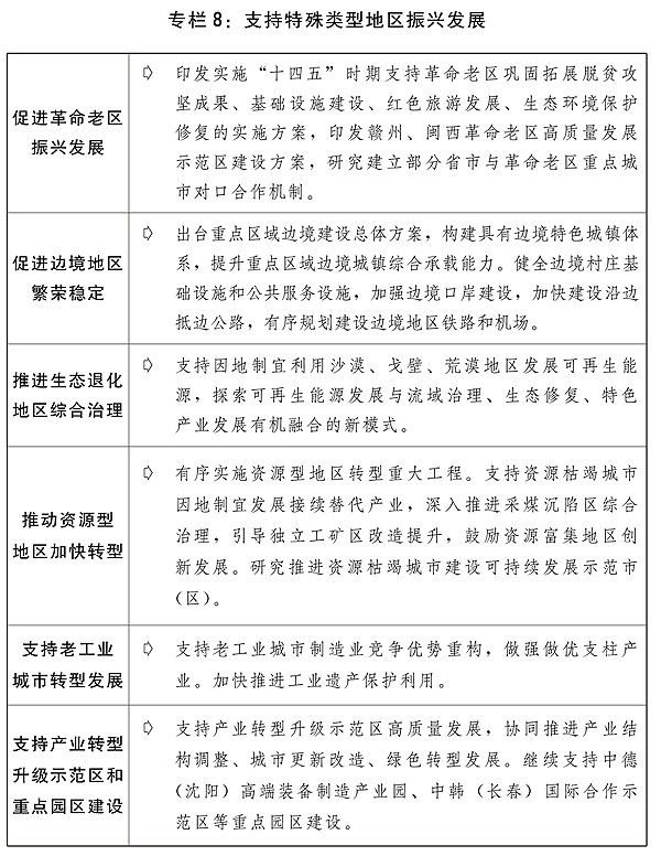 二是提高區(qū)域協(xié)調(diào)發(fā)展水平。推動西部大開發(fā)形成新格局,發(fā)揮風、光、水電和礦產(chǎn)資源優(yōu)勢建設大型清潔能源基地。積極發(fā)展文化和旅游產(chǎn)業(yè)。實施重要生態(tài)系統(tǒng)保護和修復工程,加快重大項目規(guī)劃建設。推進貴州大數(shù)據(jù)綜合試驗區(qū)建設。積極穩(wěn)妥推進雅魯藏布江下游水電開發(fā)等重大工程。推動東北振興取得新突破,組織實施好東北全面振興“十四五”實施方案,繼續(xù)推進黑瞎子島中俄國際合作示范區(qū)建設,積極推動大小興安嶺林區(qū)生態(tài)保護與經(jīng)濟轉(zhuǎn)型,穩(wěn)步推進長吉圖開發(fā)開放先導區(qū)發(fā)展,推動《東北振興重點項目三年滾動實施方案》重點項目加快建設。推動中部地區(qū)高質(zhì)量發(fā)展,推動湘鄂贛協(xié)同高質(zhì)量發(fā)展,支持晉陜豫黃河金三角承接產(chǎn)業(yè)轉(zhuǎn)移示范區(qū)建設,支持山西進一步深化能源革命綜合改革試點,推進淮海合作區(qū)協(xié)同發(fā)展,支持中國(武漢)光谷建設,編制出臺洞庭湖生態(tài)經(jīng)濟區(qū)規(guī)劃。鼓勵東部加快高質(zhì)量發(fā)展,支持福建高質(zhì)量發(fā)展及平潭綜合實驗區(qū)建設,推動山東新舊動能轉(zhuǎn)換綜合試驗區(qū)建設取得新進展。支持民族地區(qū)改善生產(chǎn)生活條件,加強各民族交流交往交融,鑄牢中華民族共同體意識。推動革命老區(qū)、邊境地區(qū)、生態(tài)退化地區(qū)、資源型地區(qū)、老工業(yè)城市等特殊類型地區(qū)振興發(fā)展,推進國家級新區(qū)、臨空經(jīng)濟示范區(qū)、承接產(chǎn)業(yè)轉(zhuǎn)移示范區(qū)等功能平臺建設,推動國家自主創(chuàng)新示范區(qū)和高新區(qū)高質(zhì)量發(fā)展。支持海洋經(jīng)濟發(fā)展示范區(qū)、現(xiàn)代海洋城市等建設,提升海洋資源開發(fā)利用水平。