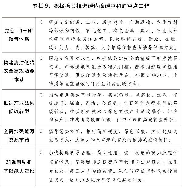 二是積極穩(wěn)妥推進碳達峰碳中和。完善碳達峰碳中和“1+N”政策體系,實施“碳達峰十大行動”,堅持“全國一盤棋”。大力發(fā)展非化石能源,建設大型風電、光伏基地項目,積極發(fā)展分布式新能源,積極推動海上風電集群化開發(fā),穩(wěn)妥推進西南等地大型水電基地建設,大力發(fā)展抽水蓄能,在確保絕對安全的前提下積極有序發(fā)展核電,推進煤炭清潔高效利用。提升電網(wǎng)對可再生能源發(fā)電的消納能力。做好全國碳排放權(quán)交易市場第二個履約周期管理。實施節(jié)能降碳改造升級。積極研究開發(fā)碳捕捉利用與封存技術(shù)。優(yōu)化完善能耗雙控政策,合理增加能耗總量彈性,新增可再生能源和原料用能不納入能源消費總量控制,推動能耗“雙控”向碳排放總量和強度“雙控”轉(zhuǎn)變。全面加強能源資源節(jié)約,強化工業(yè)、交通和建筑節(jié)能,不斷降低單位產(chǎn)出能耗物耗和碳排放。對標能效標桿水平,推動能效低于基準水平的重點行業(yè)企業(yè),有序?qū)嵤└脑焐?,促進高耗能行業(yè)高質(zhì)量發(fā)展。繼續(xù)做好碳達峰碳中和及應對氣候變化國際談判與合作,主動參與全球綠色治理體系建設,加強綠色經(jīng)貿(mào)、技術(shù)與金融合作。