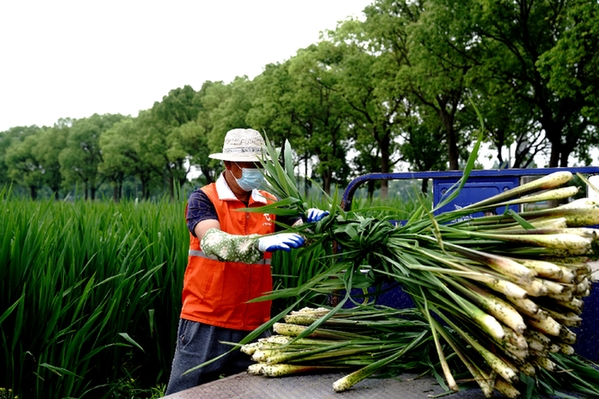 5月15日,上海青浦區(qū)練塘鎮(zhèn)茭農(nóng)在種植基地里采收茭白。