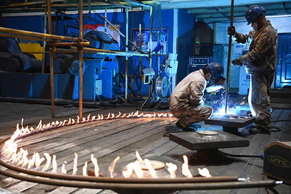 電焊工在哈電電機(jī)公司冷作分廠作業(yè)。記者 王建威 攝