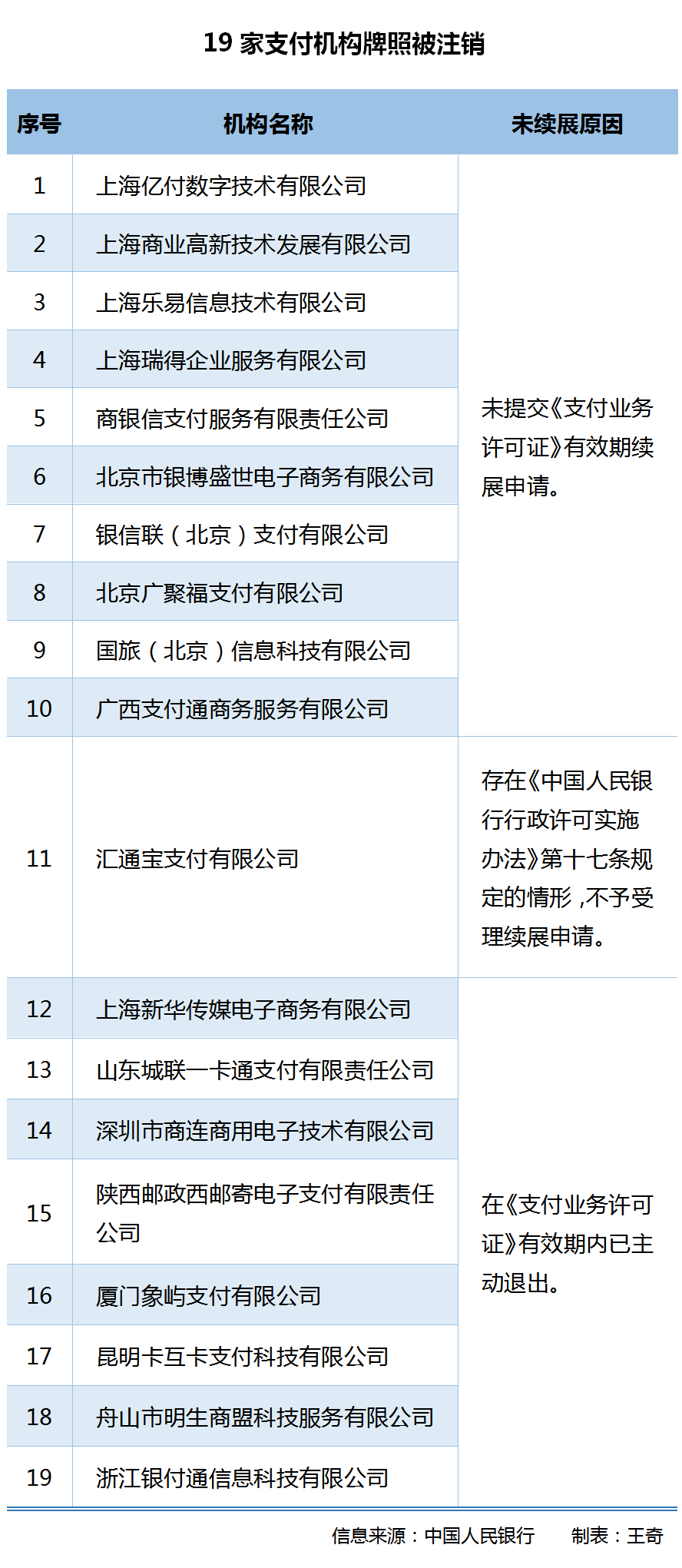 此次公布的續(xù)展結(jié)果,19家注銷的支付牌照中,上海億付數(shù)字技術(shù)有限公司、上海商業(yè)高新技術(shù)發(fā)展有限公司、上海樂易信息技術(shù)有限公司等10家機構(gòu)因未提交《支付業(yè)務(wù)許可證》有效期續(xù)展申請而不再續(xù)展;海新華傳媒電子商務(wù)有限公司、山東城聯(lián)一卡通支付有限責任公司、深圳市商連商用電子技術(shù)有限公司等8家機構(gòu)在《支付業(yè)務(wù)許可證》有效期內(nèi)主動退出。
