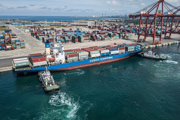 一艘中遠海運集裝箱貨輪在兩艘拖輪的輔助下,靠泊進海南洋浦小鏟灘碼頭。記者 蒲曉旭 攝