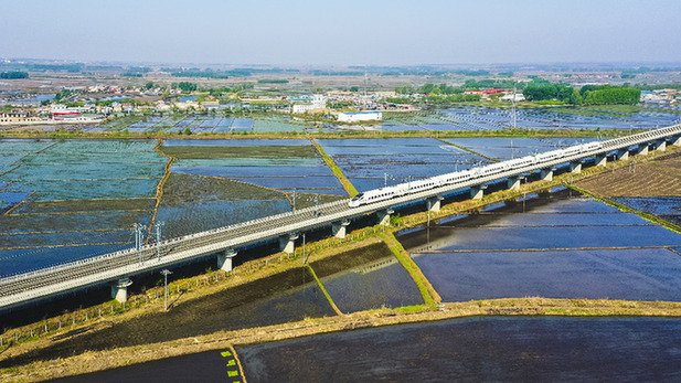 在哈牡高鐵線上,一列動(dòng)車組列車正從稻田間駛過(guò)。資料照片