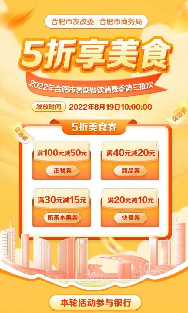 合肥也于8月19日開始發(fā)放暑期消費(fèi)季第三批消費(fèi)券,共計(jì)1844萬(wàn)元。據(jù)了解,此次發(fā)放的是餐飲消費(fèi)券,分為滿100元減50元正餐券、滿40元減20元甜品券、滿30元減15元奶茶水果券和滿20元減10元快餐券,采取電子券形式發(fā)放,消費(fèi)者可通過(guò)登錄多家銀行APP領(lǐng)取。