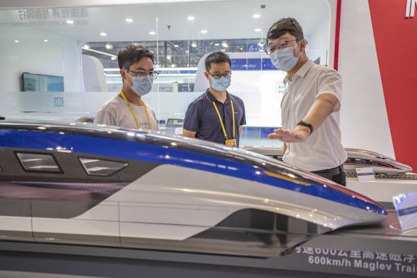 8月22日,在2022智博會(huì)中國(guó)中車(chē)展廳,工作人員(右)向嘉賓介紹時(shí)速600公里高速磁懸浮交通系統(tǒng)。新華社記者 黃偉 攝?