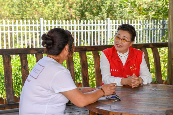 8月24日,吳亞琴(右)與團(tuán)山街道長(zhǎng)山花園社區(qū)的樓棟黨支部書記李杰聊天。新華社記者 張楠 攝