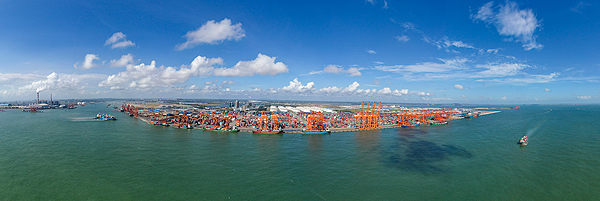 圖為8月27日拍攝的位于平陸運(yùn)河出海口附近的北部灣港欽州港區(qū)大欖坪作業(yè)區(qū)(無(wú)人機(jī)照片)。新華社記者 曹祎銘 攝
