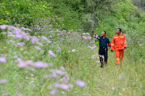 兩名林業(yè)工作人員在延安市寶塔區(qū)南泥灣鎮(zhèn)孟湫溝內(nèi)巡查。記者 邵瑞 攝