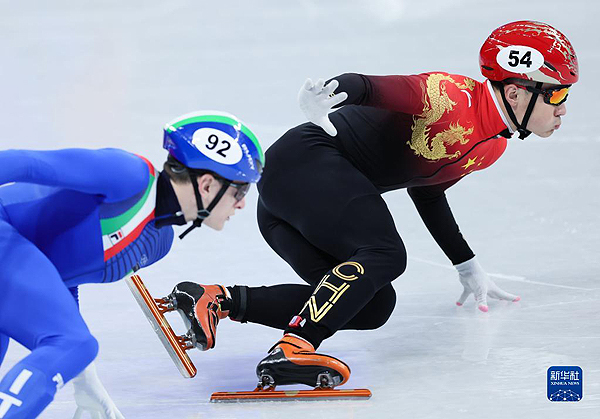 2022年2月5日,在首都體育館舉行的北京2022年冬奧會短道速滑項目混合團(tuán)體接力決賽中,中國隊奪得冠軍。這是中國隊選手任子威(右)在比賽中。新華社記者 蘭紅光 攝