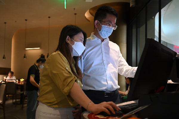 郵儲銀行工作人員(右)在湯城小廚查看企業(yè)經(jīng)營情況。記者 潘悅 攝