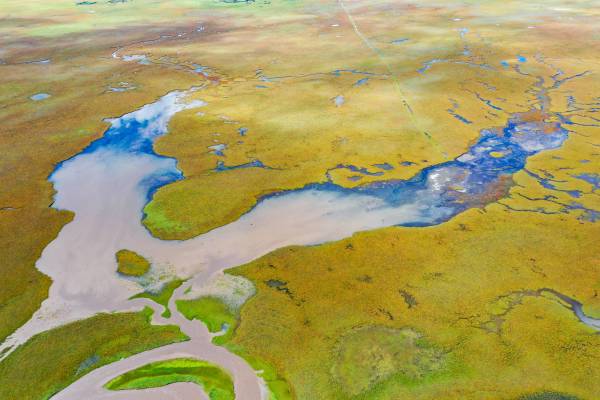 這是瑪曲縣阿萬倉濕地內(nèi)的一處沼澤(9月17日攝,無人機照片)。