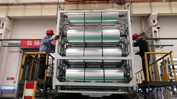 金秋時(shí)節(jié),在隴西鋁箔的車間里,生產(chǎn)場(chǎng)面火熱:巨龍般的機(jī)器將鋁材不斷傳送過(guò)來(lái),展平輥像搟面杖一樣,將鋁材“搟”薄。經(jīng)過(guò)軋制、精整、退火等工序,原本厚230至280微米的鋁材最終“瘦身”成4.5至6微米薄厚的高端鋁箔。
