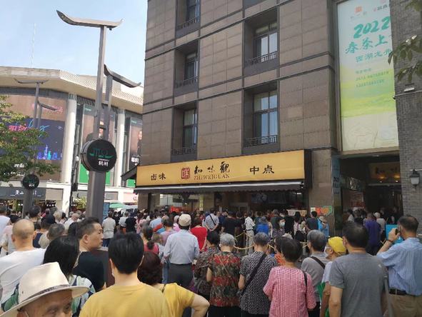 消費者在排隊購買知味觀的鹵味熟食和點心糕點等產(chǎn)品。(受訪者供圖)