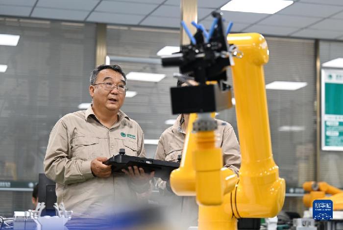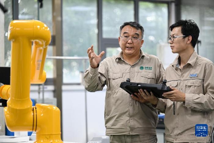 張黎明和同事在調(diào)試第四代配網(wǎng)帶電作業(yè)機器人(2022年9月8日攝)。新華社記者 趙子碩 攝