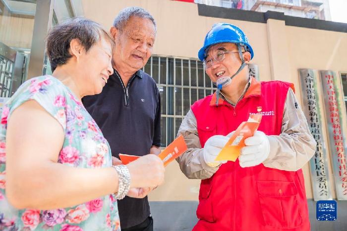 張黎明(右)在天津市濱海新區(qū)丹東里小區(qū)向居民宣講安全用電常識(2022年7月15日攝)。新華社發(fā)(李津攝)