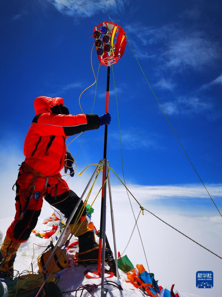 2020珠峰高程測(cè)量登山隊(duì)隊(duì)員在珠穆朗瑪峰峰頂開(kāi)展測(cè)量工作(2020年5月27日攝)。新華社特約記者 扎西次仁 攝