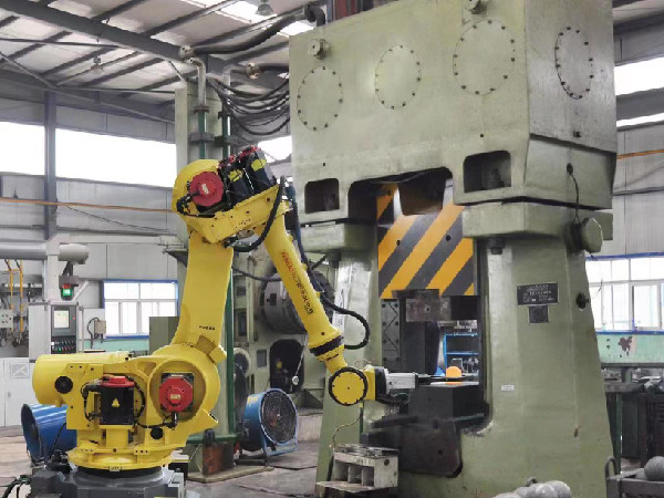 在鋼諾公司車間,一臺機器人站在裁切、沖壓兩個工序間,用鋼鉗轉移8公斤重的鋼段,連續(xù)10小時重復一個動作,每天可搬運40噸原料,其效率、安全性和精準度遠超人工。