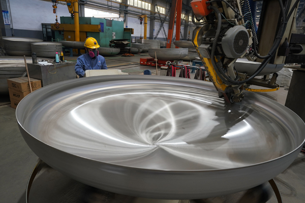 工人在位于興仁鎮(zhèn)的南通四方罐式儲運設(shè)備制造有限公司標(biāo)罐車間忙碌。