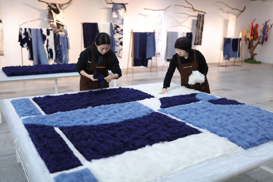 問起“回到源頭”的工藝,最大的訣竅是什么?郭秀玲坦然地說,用手“慢慢地、耐心地拍”。在耐心拍的過程中,不同著色的羊絨,它們的細(xì)纖維彼此自然地“拍合”。藝術(shù)設(shè)計,不再是由流水線說一不二地完成,而是在人手與自然材質(zhì)的“可能性”中呈現(xiàn)。所以,每一件制品,都是“這一個”,沒有完全雷同的。