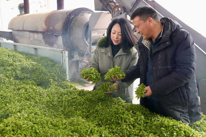 福建省連江縣長龍鎮(zhèn)一家制茶企業(yè)負(fù)責(zé)人在查看待加工的茶青(3月28日攝)。