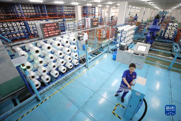 在位于江蘇省蘇州市吳江區(qū)的恒力(蘇州)產(chǎn)業(yè)園內(nèi)的高性能滌綸工業(yè)絲智能車(chē)間內(nèi),員工對(duì)工業(yè)絲進(jìn)行包裝前的外檢作業(yè)(3月15日攝)。新華社記者 毛俊 攝