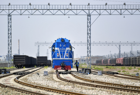 5月11日,在新疆霍爾果斯鐵路口岸,工作人員在駝峰場檢查火車頭。