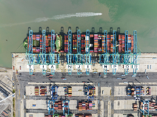 一艘貨輪靠泊在天津港“智慧零碳”碼頭進(jìn)行裝卸作業(yè)(無(wú)人機(jī)照片)?!⌒氯A社發(fā)(韓喜龍 攝)