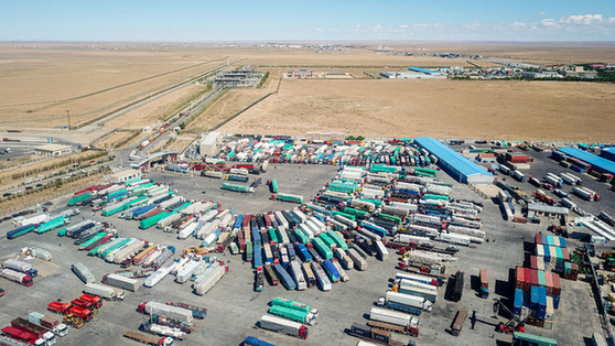 6月11日,二連浩特口岸旁的進(jìn)出口物流園區(qū)中大量貨運(yùn)卡車排隊(duì)準(zhǔn)備出關(guān)(無(wú)人機(jī)照片)。 記者 彭源 攝