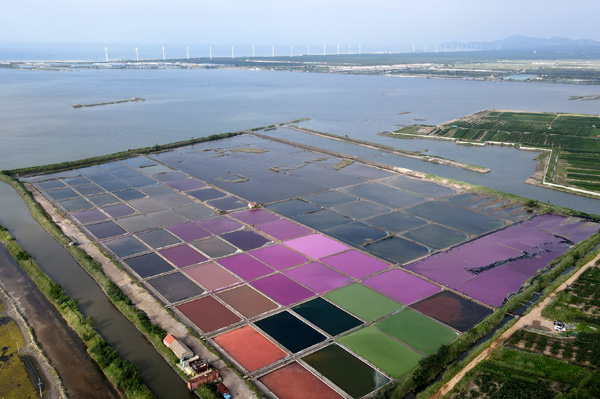 8月7日,山東省榮成市港西鎮(zhèn)海邊的鹽田在晴空的映襯下呈現(xiàn)出五顏六色的美麗景象。