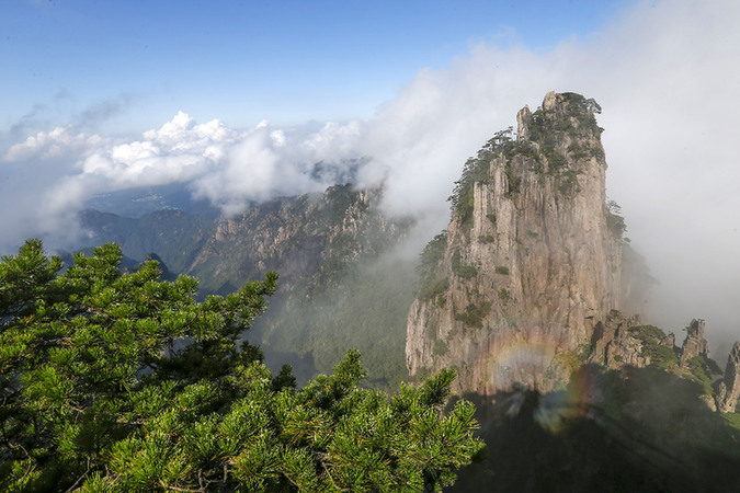 當(dāng)日,雨后初霽的安徽省黃山風(fēng)景區(qū)出現(xiàn)秋日迷人的藍(lán)天云海,在陽(yáng)光的照耀下,罕見(jiàn)的“佛光”在云海中若隱若現(xiàn),與奇峰相映成趣。