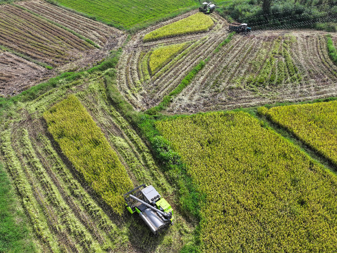 金秋時(shí)節(jié),瀏陽市沿溪鎮(zhèn)種植的中稻迎來收獲季,當(dāng)?shù)剞r(nóng)民搶抓農(nóng)時(shí)收割水稻,稻田里一派繁忙景象。