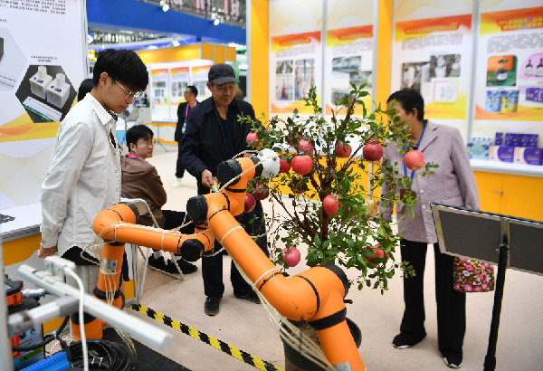 參觀者被第30屆楊凌農(nóng)高會(huì)上的一款采摘機(jī)器人吸引。