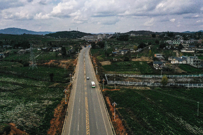 鄉(xiāng)鎮(zhèn)公交車行駛在貴州省威寧縣迤那鎮(zhèn)開往牛棚鎮(zhèn)的公路上(無人機(jī)照片)。資料照片