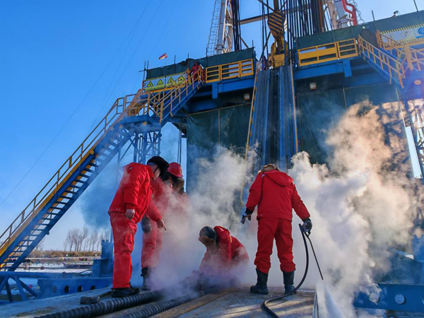 瓦藍的天空、皚皚的白雪、噴涌的石油,工人們鮮艷的紅色工作服在陽光下十分耀眼……在萬家團圓的新春佳節(jié),巴彥油田的300多名員工還堅守在采油一線。