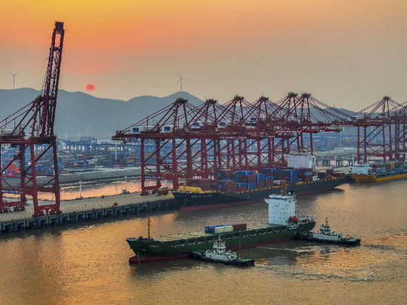 浙江寧波舟山港金塘港區(qū)碼頭作業(yè)繁忙(2024年2月11日攝,無(wú)人機(jī)照片)。 新華社發(fā)(姚峰 攝)