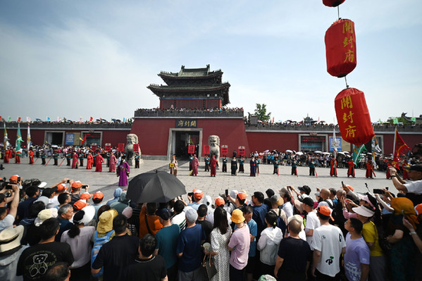 5月19日,游客在河南省開(kāi)封市開(kāi)封府觀看表演。 新華社發(fā)(李俊生 攝)